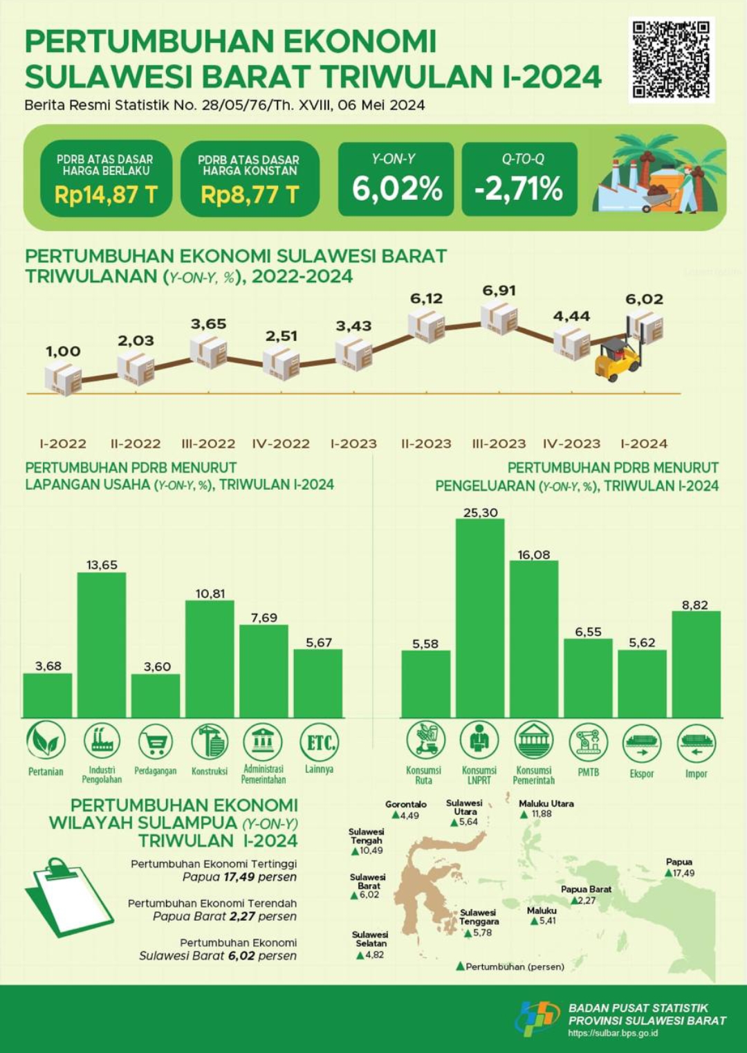 Berdasarkan data Badan Pusat Statistik, Perekonomian Sulawesi Barat tumbuh sebesar 6,02 persen YoY pada triwulan I 2024. Pertumbuhan Sulawesi Barat ini tercatat di atas pertumbuhan nasional dan merupakan urutan ke-5 pertumbuhan tertinggi di Indonesia.