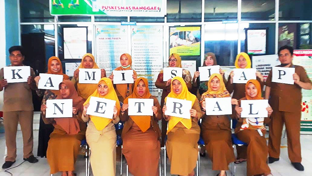 Menggunakan kertas bertuliskan slogan netral, Kepala Puskesmas Banggae I dr Surijanti Jaddu dan belasan ASN di tempat ini memproklamirkan komitmennya menghadapi Pilkada 2020.