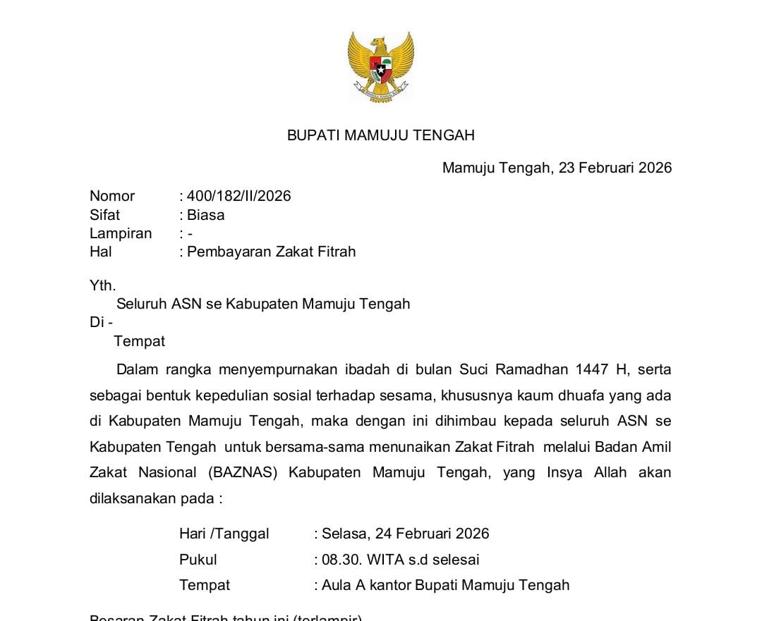 Imbauan tersebut tertuang dalam surat bernomor 400/182/II/2026 tertanggal 23 Februari 2026, perihal Pembayaran Zakat Fitrah. Dalam surat itu disebutkan bahwa pembayaran zakat fitrah merupakan bagian dari upaya menyempurnakan ibadah di bulan suci Ramadan 1447 Hijriah, sekaligus sebagai bentuk kepedulian sosial terhadap sesama, khususnya kaum dhuafa di wilayah Kabupaten Mamuju Tengah.