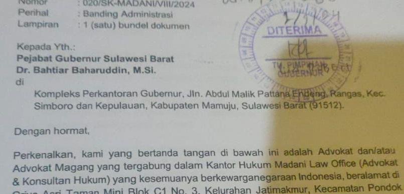 Majene-Nuansa.info- Erisusanto melalui kuasa hukumnya, melayangkan surat banding administrasi kepada Pejabat Gubernur Sulawesi Barat di Mamuju, Senin (02/09/2024). Banding administrasi itu se kaitan dengan rangkaian tindakan Bupati Kabupaten Majene dalam mengangkat dan melantik Direktur Utama, Direktur Operasional dan Teknik serta Direktur Umum dan Keuangan Perusahaan Umum Daerah Aneka Usaha Kabupaten Majene tanggal 25 Juni 2024 dan 29 Juli 2024, yang diduga melanggar asas legalitas, perlindungan terhadap hak asasi manusia, Asas-Asas Umum Pemerintahan yang Baik, serta peraturan perundang-undangan lainnya.