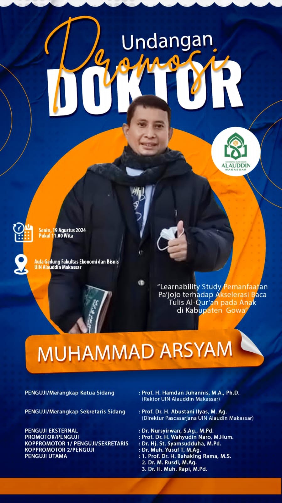 Sidang ini dimulai pukul 11.00 Wita di Gedung Fakultas Ekonomi dan Bisnis dan akan dipimpin oleh Prof. H. Hamdan Juhannis, Rektor UIN Alauddin Makassar. Panel penguji utama, yang terdiri dari Prof. Dr. H. Abustani Ilyas, Direktur Pascasarjana UIN Alauddin, dan penguji eksternal Dr. Nursyirwan, akan memberikan penilaian terhadap inovasi ini. Promotor disertasi Arsyam adalah Prof. Dr. H. Wahyudin Naro dan Dr. Hj. St. Syamsudduha, dengan dukungan ko-promotor Dr. Muh. Yusuf T dan Prof. Dr. H. Bahaking Rama.