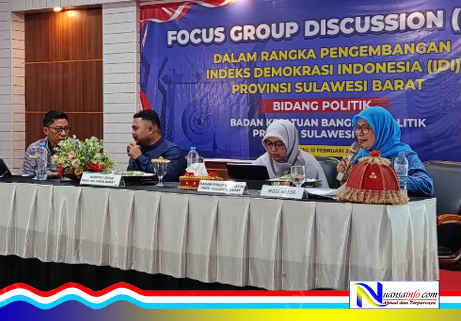 Mamuju, nuansainfo.com – Pemerintah Provinsi Sulawesi Barat melalui Badan Kesbangpol menggelar Focus Group Discussion (FGD) pengembangan Indeks Demokrasi Indonesia (IDI) bidang Politik di Hotel Berkah, Kamis (12/2/2026).