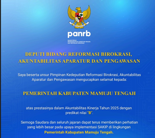 Mateng, nuansainfo.com – Kabupaten Mamuju Tengah, yang resmi berdiri sebagai daerah otonom pada 2013, mencatat terobosan penting dalam reformasi birokrasi. Untuk pertama kalinya, Mamuju Tengah meraih Penghargaan SAKIP dan Zona Integritas (ZI) Tahun 2026 dengan predikat B dari Kementerian PANRB, melalui Deputi Bidang Reformasi Birokrasi.