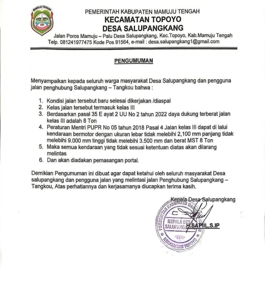Pemerintah Desa Salupangkang menegaskan bahwa kendaraan yang tidak memenuhi ketentuan tersebut akan dilarang melintas. Sebagai langkah pengawasan, pihak desa juga akan melakukan pemasangan portal pada ruas jalan dimaksud.