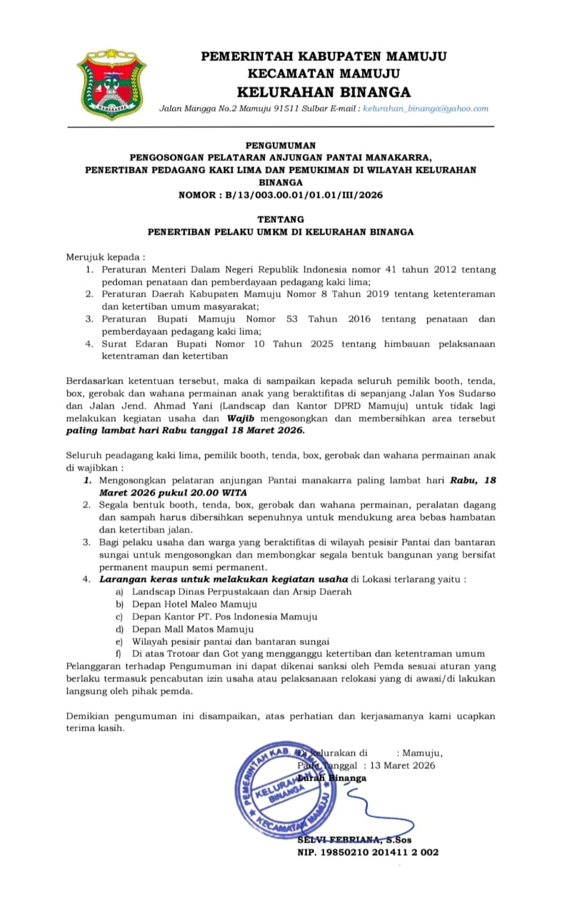 Mamuju, nuansainfo.com Pemerintah Kelurahan Binanga, Kecamatan Mamuju, mengeluarkan pengumuman resmi terkait penertiban pelaku UMKM dan pedagang kaki lima (PKL) di kawasan pelataran Anjungan Pantai Manakarra. Kebijakan ini dilakukan untuk menata kembali kawasan pesisir dan menjaga ketertiban umum.