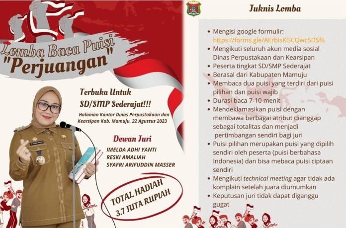 Mamuju, nuasa.info – Dalam rangka menyemarakkan kemerdekaan Republik Indonesia ke 78 tahun Dinas Perpustakaan dan Kearsipan (Dispusip) Kabupaten Mamuju akan menggelar lomba baca puisi pada Selasa 22 Agustus 2023 mendatang.