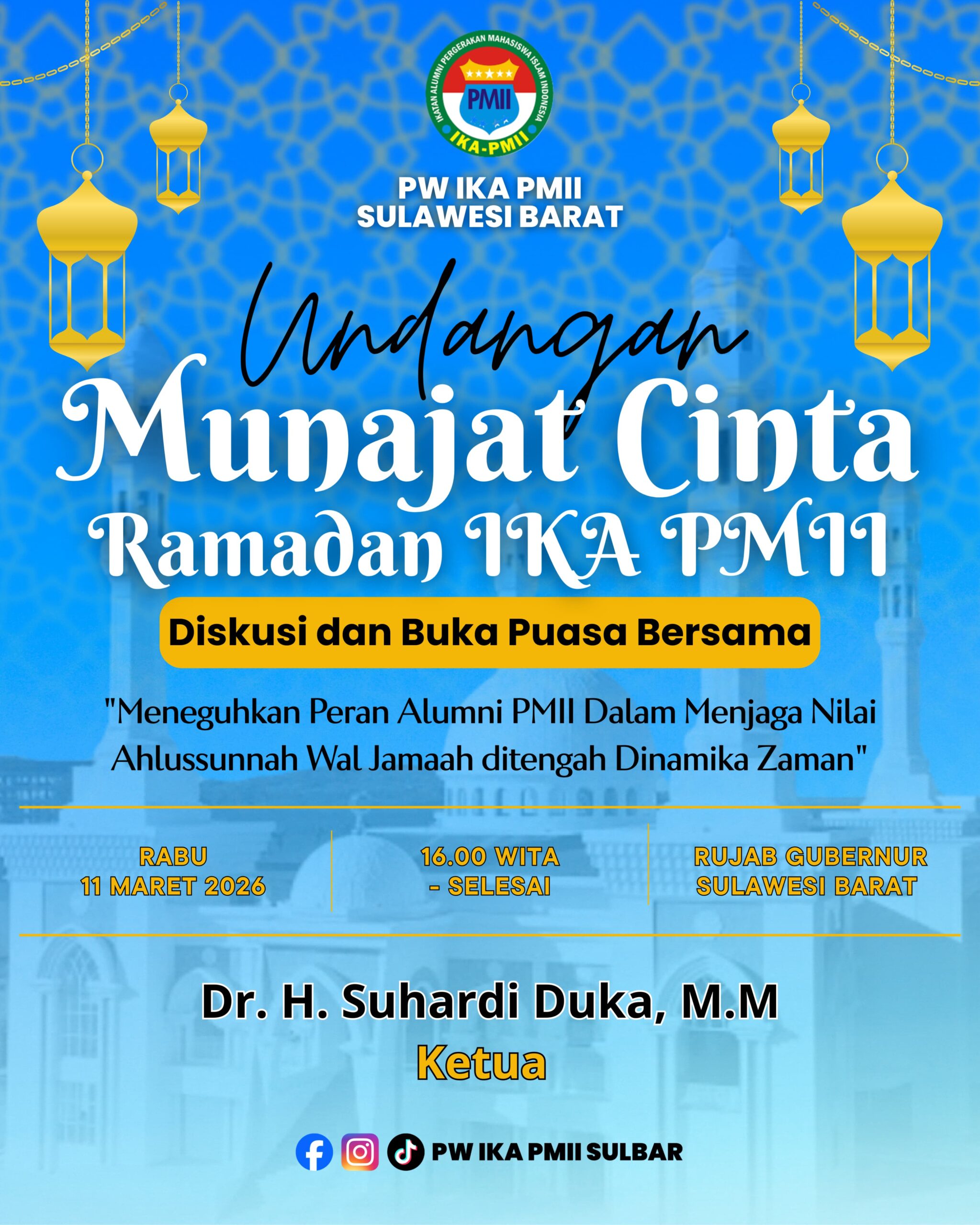 Mamuju, nuansainfo.com – Pengurus Wilayah Ikatan Alumni Pergerakan Mahasiswa Islam Indonesia (PW IKA PMII) Sulawesi Barat menjadwalkan agenda “Munajat Cinta Ramadan IKA PMII” yang akan dilaksanakan pada Rabu, 11 Maret 2026. Kegiatan ini mengombinasikan sesi diskusi mendalam dengan buka puasa bersama para alumni.